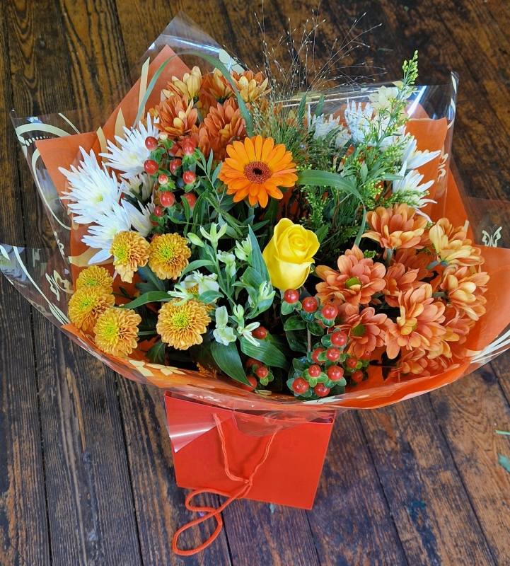 A selection of seasonal red, orange and yellow flowers arranged as an aqua handtied with a bubble of water at the bottom in a presentation box so it stands on its own.