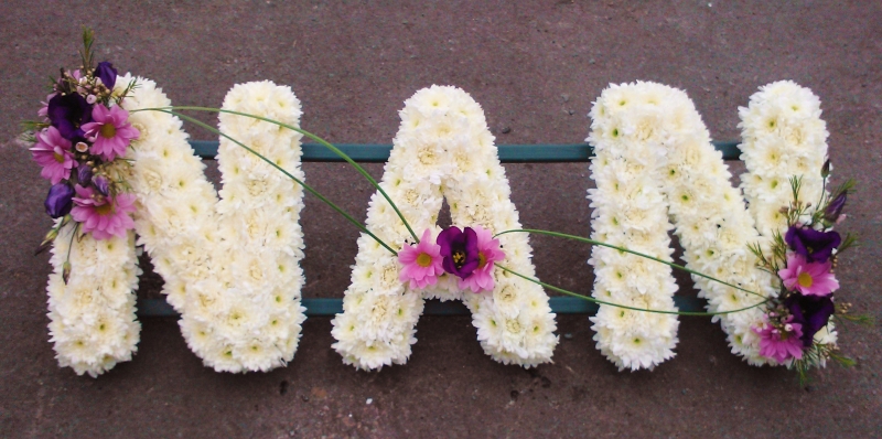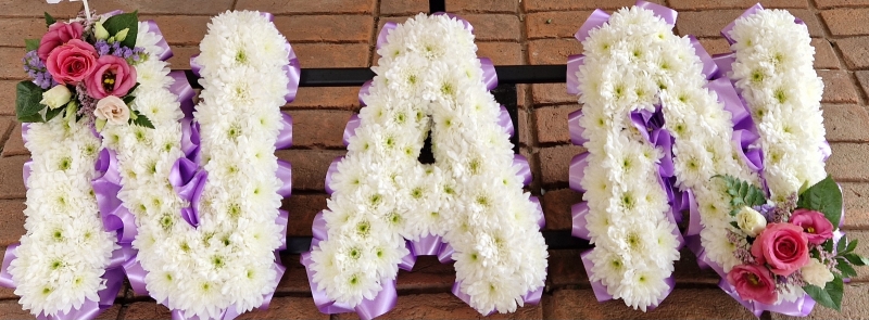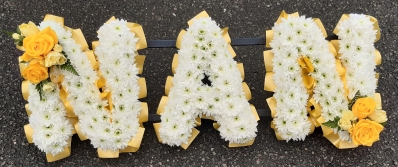 Nan lettering funeral flowers with a ribbon edge, white Chrysanthemum base and coloured sprays of your choice.