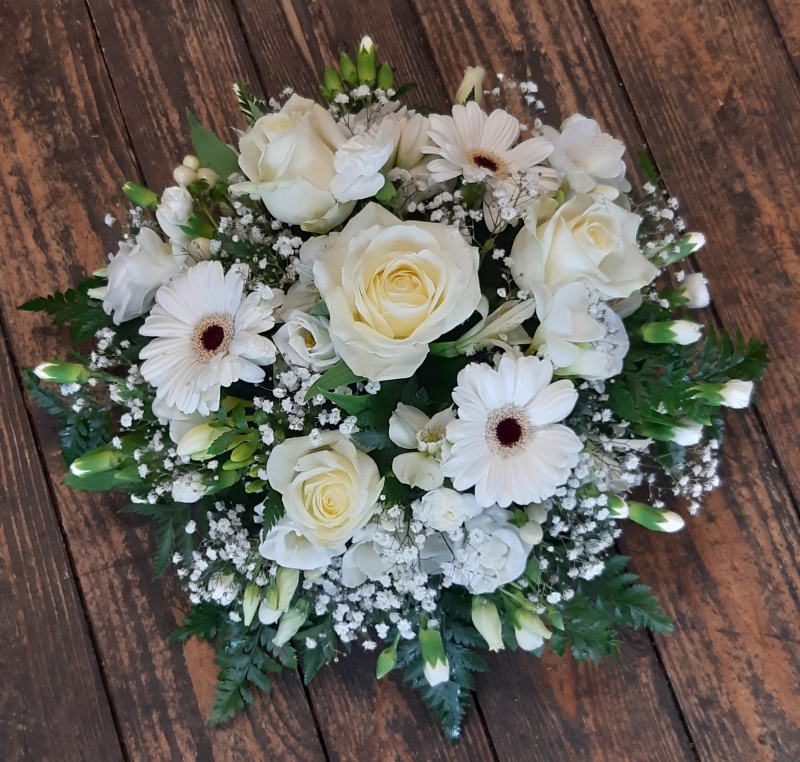 Mixture of white, cream and green flowers arranged as a circular posy in foam. Flowers may vary from picture depending on season and availability.