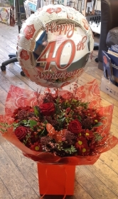 Ruby red anniversary bouquet of various seasonal red flowers with a 40th anniversary balloon.