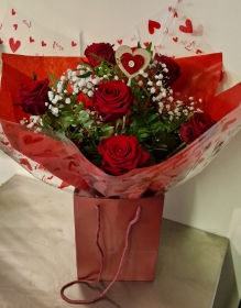 A bouquet of 6 luxury red roses, finished off perfectly with foliage and gift wrapped as an aqua handtied with a bubble of water in a presentation bag.