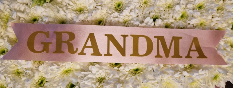 A ribbon sash is a nice personalised addition to any funeral tribute. It suites better on flatter designs such as Wreaths, Cushions, Hearts, Pillows or a Posy. Simply choose you ribbon colour and amount of letters, then at the checkout tell us what name or word you would like.